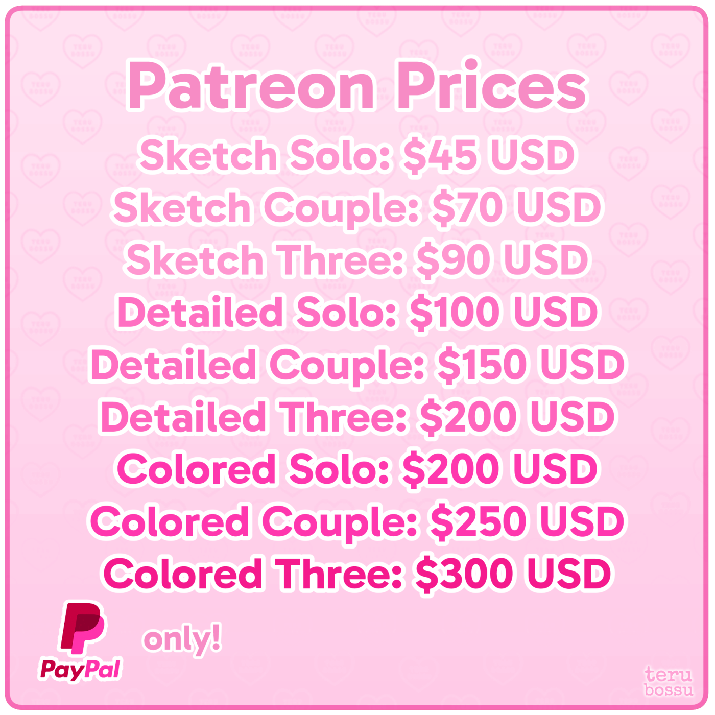Those who have been subscribed to the Adorable ($7) tier on Patreon for AT LEAST 3 months, will get a discount on commission prices: